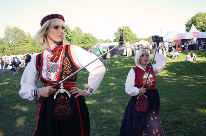 Vi får høre at de dagen i forveien hadde kledd seg ut som nazister, og at de delte ut brosjyrer. En Kunst på Øya-frivillig forteller oss at de skal provosere. Åpenbart. I dag har de gått for bunad og selfiestang — de svaier seg rundt på festivalområdet og knipser bilder av seg selv. Det er estetisk tilfredsstillende.