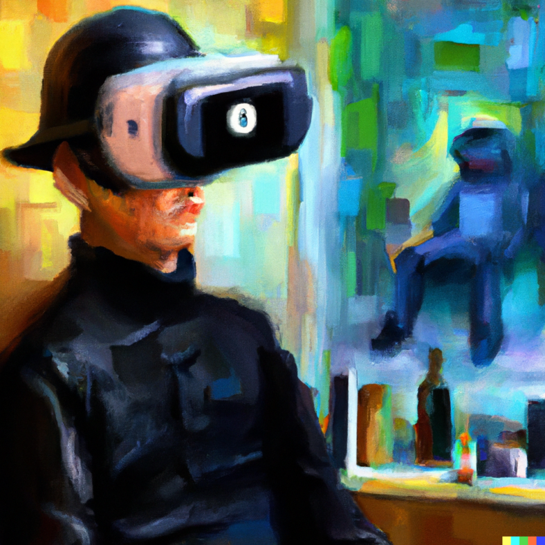 Bildet er generert av Subjekt via KI-en Dall-E med instruksjon «Futuristic painting of a junkie addicted to AI virtual reality».