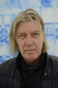 Han er rufsete i håret, har en tynn boblejakke og camo-bukser på. Han forteller at det har vært utfordrende å arbeide i de nye lokalene til Galleri Riis, som er delt opp i to deler, begge med to rom.