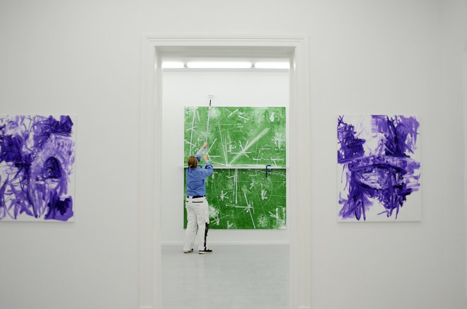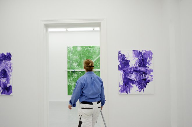 – Farge er først og fremst et middel for differensiering. Men den kan også bli brukt til å mene noe: den kan brukes til å foreslå eller unngå noe. For eksempel, de rutete maleriene handler om oppfatning av rom, og de er blå fordi det støtter en slik lesning. Den grønne fargen jeg bruker valgte jeg på grunn av dens maleriske, tekniske egenskaper. Det er en farge med mye substans, så å si, og kan brukes på mange forskjellige måter. Men jeg har også arbeidet med den fordi den ikke har konnotasjoner av verdensrommet som for eksempel svart eller mørk blå ville hatt. Med de lilla malerine ønsket jeg å gjøre noe med umiddelbarheten og enkelheten i en tegning – derfor denne spesielle lillafargen som ikke, i likhet med de fleste lillafarger, endrer fargetone fra blå til rød når den er blandet med hvitt. Så jeg valgte det for å unngå en koloristisk effekt.
