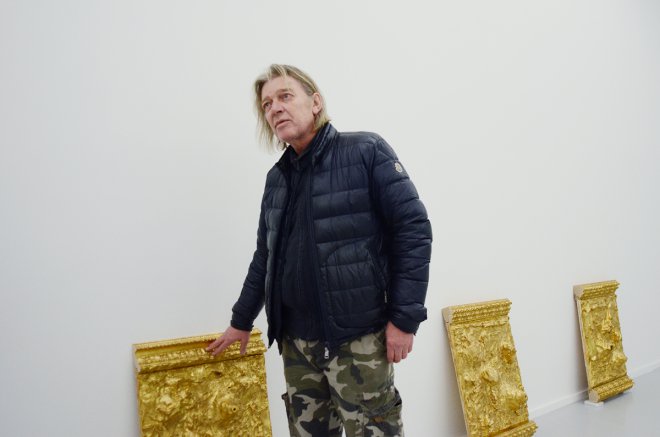 – Å, det var bare noe for å henge opp disse verkene, svarer han og peker på tre verk i gull som står på gulvet.