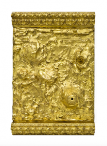 Troels Wörsel, Uten tittel, 2017. Tre, akrylmasse, bladgull, 70 x 50 x 17,5 cm (Foto: Galleri Riis)