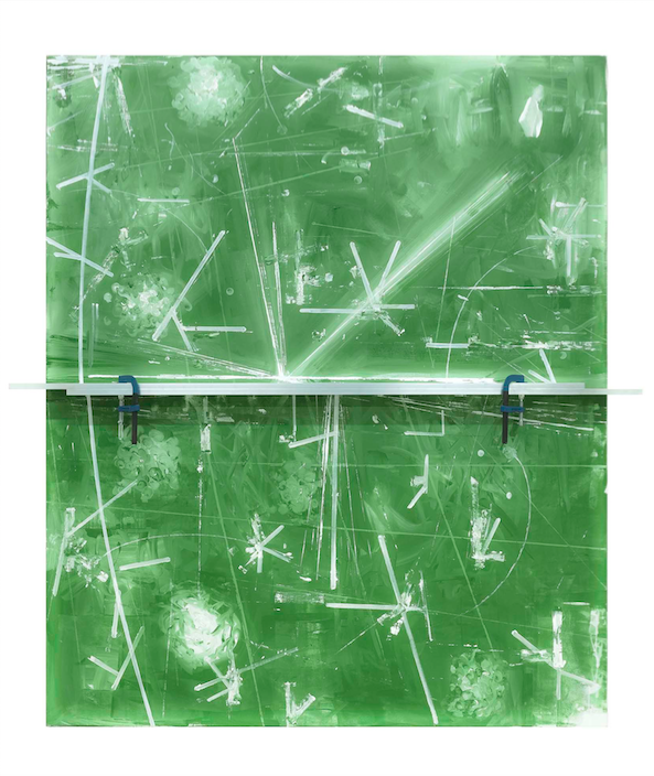 Maleriene Wörsel refererer til er to store, grønne malerier med klemmer og alluminiumsprofiler. I utstillingsteksten beskriver kunstneren kvantefenomenet han har “lagt til” disse maleriene, som går ut på at partikler med til og med store avstander mellom hverandre umiddelbart går inn i samme tilstand hvis tilstanden til en av dem endres.