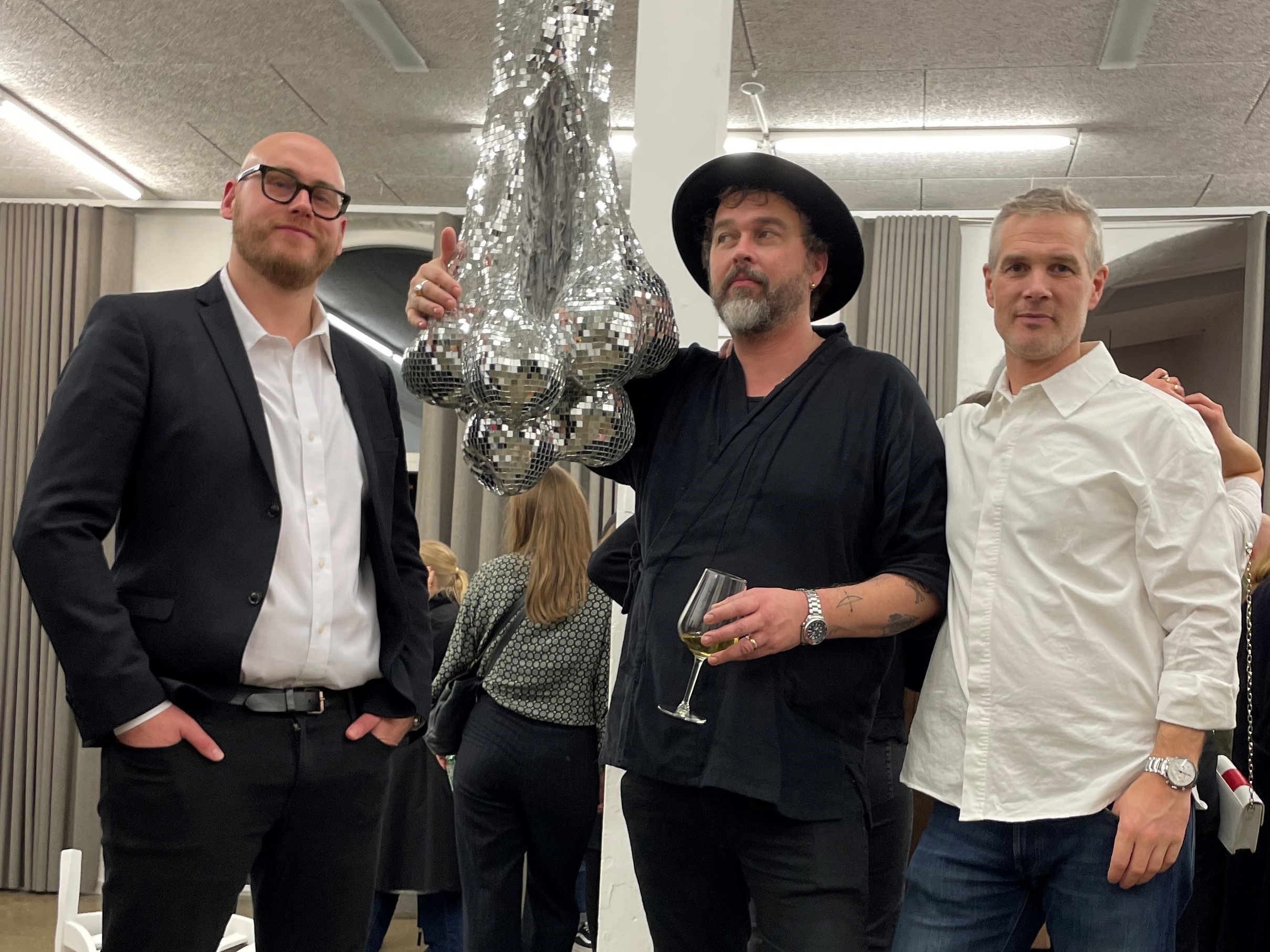 Tidligere museumsdirektør Erlend Høyersten (i midten), kunstner Roald Andersend d.y (t.h.). og gallerist Jacob Bjørn med en ny versjon av «Disco». (Foto: Privat.)