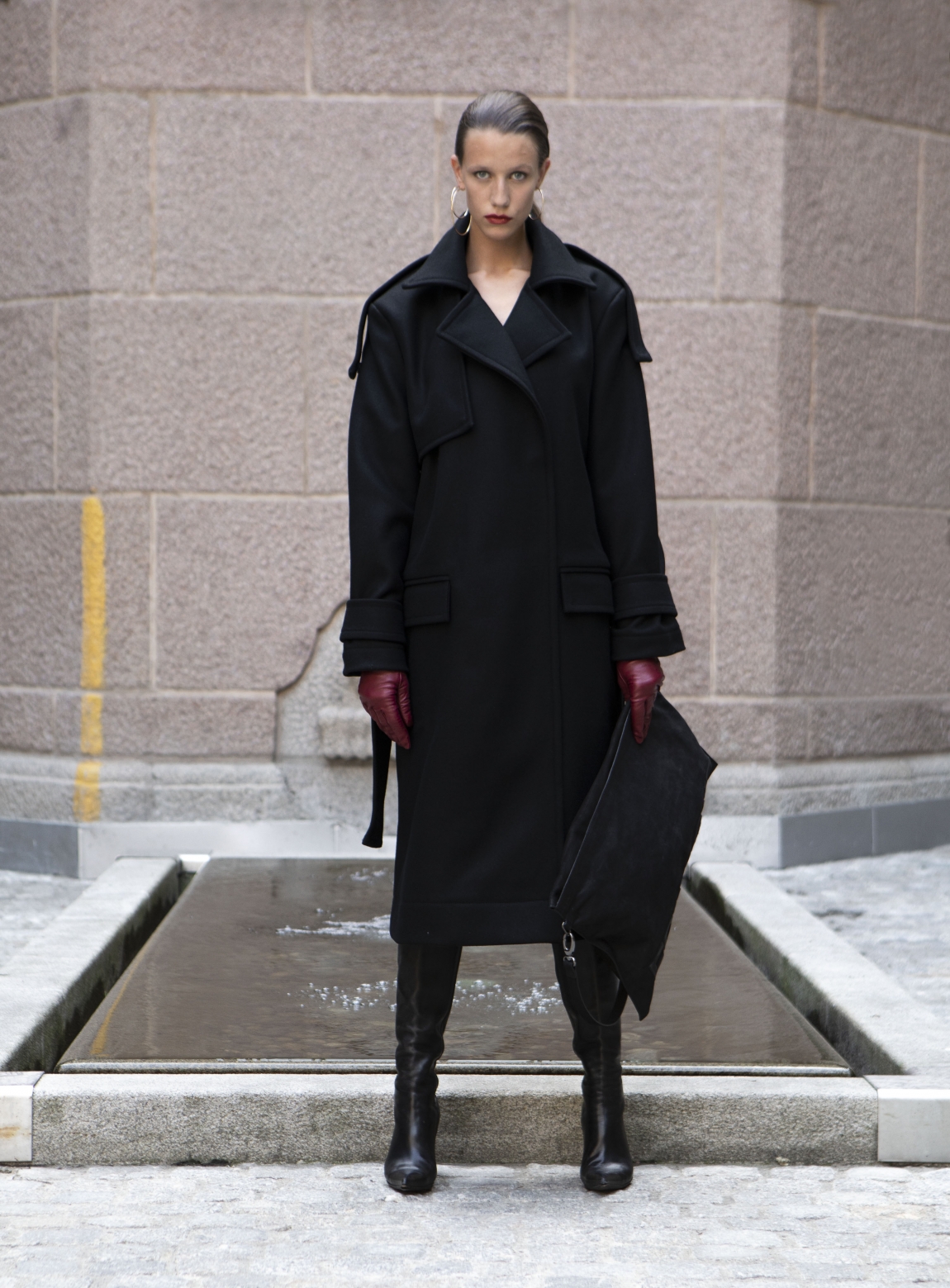 Den beste tolkningen av den klassiske frakken kommer i den svarte utgaven midtveis i visningen. I et tynt stoff, med lange ermer og lår-høyt snitt i bena. Den leker med tanken på det maskuline opphavet til frakken, og den feminine fasongen og utførelsen.