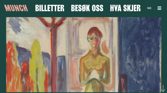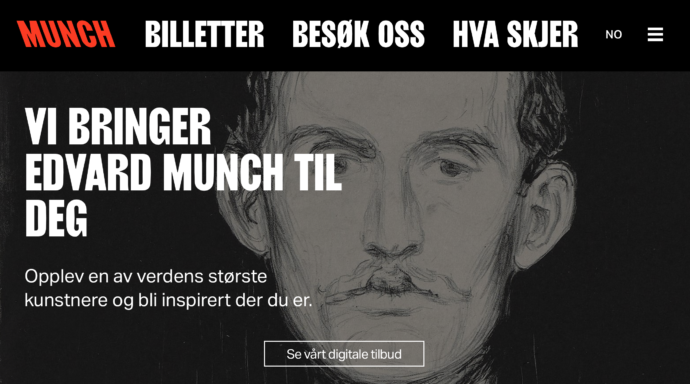 Og la oss bare si det med en gang: Det er ingen tvil om at dette er det «nye» Munchmuseets nettside. Øverst på siden, som logo og hjem-knapp, står «Munch»-navnet i harde, røde bokstaver. Sidelent, og med en ikke spesielt subtil referanse til det som nok kan kalles Norges mest omtalte knekk, går tankene umiddelbart til bygget i Bjørvika.