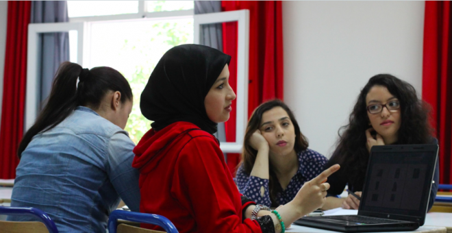 Hun svinger ut av Rabats kaotiske – og for nordmenn uforståelige – trafikksystem, og parkerer utenfor skolen hvor hun skal møte tre medstudenter. Med et kyss på hvert kinn, i ekte fransk stil, hilser de på hverandre. Allerede før døra til bygget er åpnet er diskusjonen ivrig i gang. Arabiske, franske og engelske gloser flyter inn og over i hverandre.