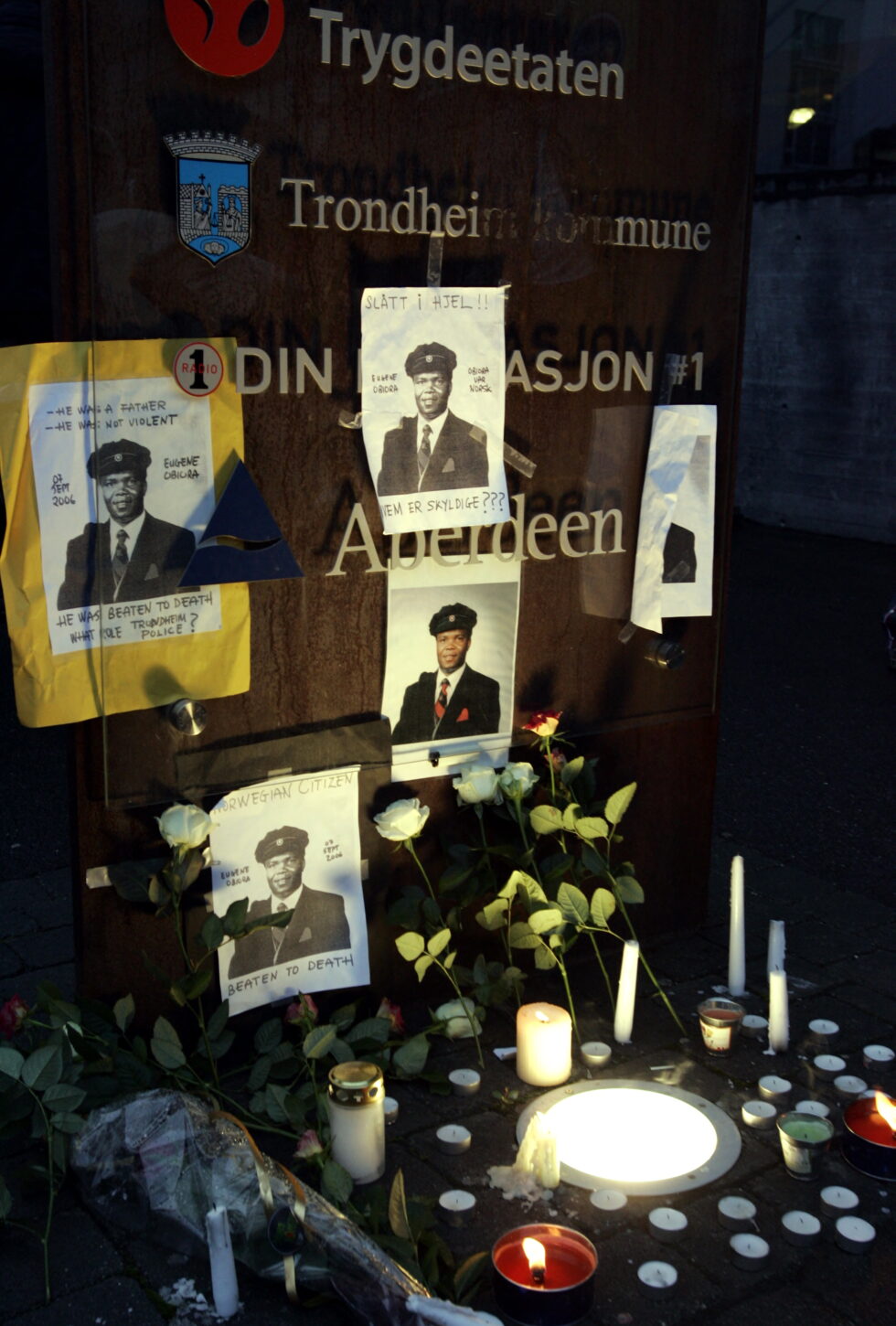 Nettverk mot statlig rasisme i Trondheim tok initiativet til et fakkeltog som protest mot politiets opptreden etter at norsk-nigerianeren Eugene Obiora døde under pågripelse i 2006. (Foto: Gorm Kallestad/NTB.)
