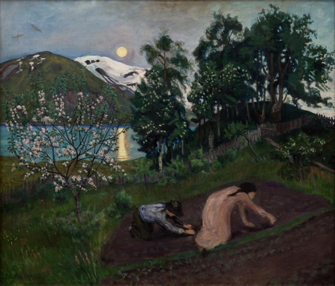 Det første verket vi møter er maleriet «Natt». I et lite format skildres en hvit villa med hage og trær i natteskumring; Astrups barndomshjem. Barndomshjemmet gjorde «uutslettelig inntrykk», kan vi lese, men monteringen minner om et kronologisk grep som føyer seg inn i nevnte stensilestetikk. Astrup var unektelig en hjemmekjær mann og skildrer sitt nærmiljø repetitivt i alle mulige variasjoner gjennom hele sitt kunstnerskap. Som åttebarnsfar (!) nedlesset av gårdsarbeidets uendelighet og med svært presset økonomi, er det allikevel ikke umulig å tenke seg at det ikke bare var inspiratoriske faktorer som bandt ham motivmessig til sitt nærmiljø.