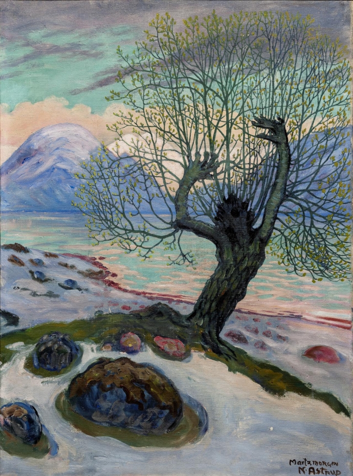 Deretter serveres en innledende veggtekst som på ingen måte definerer det vi er i ferd med å se: «I den dunkle stemningen og i skyggen av et bål vekkes naturen til live. Trær blir til troll. Fjell får fjes.» På alle måter en korrekt beskrivelse av det som foregår i Astrups maleriske univers. Astrup selv posisjonerte seg som en naturalistisk naivist, hvilket beskriver hans karakteristiske blanding av naturalisme og abstraksjon. Gjennom form og koloritt skapte han fabulerende stemninger gjennom motiver som opererer i grenselandet mellom akademisk landskapstradisjon og mytologi. Museets gode intensjoner til tross; utformingen av utstillingen utsetter Astrups arbeider for motvind og mangler den røde tråden vi blir lovet.