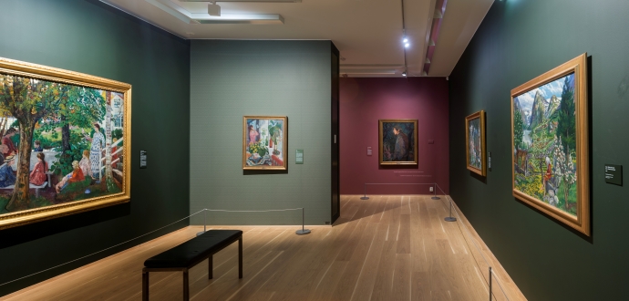 I museets permanente utstilling i andre etasje er det derimot tydelig jobbet frem paletter som underbygger stilartenes stemninger. Fra den nærmest ironiserende lakserosa som bakteppe for nasjonalromantikken, til den iskalde syke grønnfargen som bakgrunn for realismen. Vårfrisk mosegrønn komplementerer Werenskiold og kompani, mens håpefull himmelblå ledsager Harriet Backer, Ludvig Karsten og Gerhard Munthe.