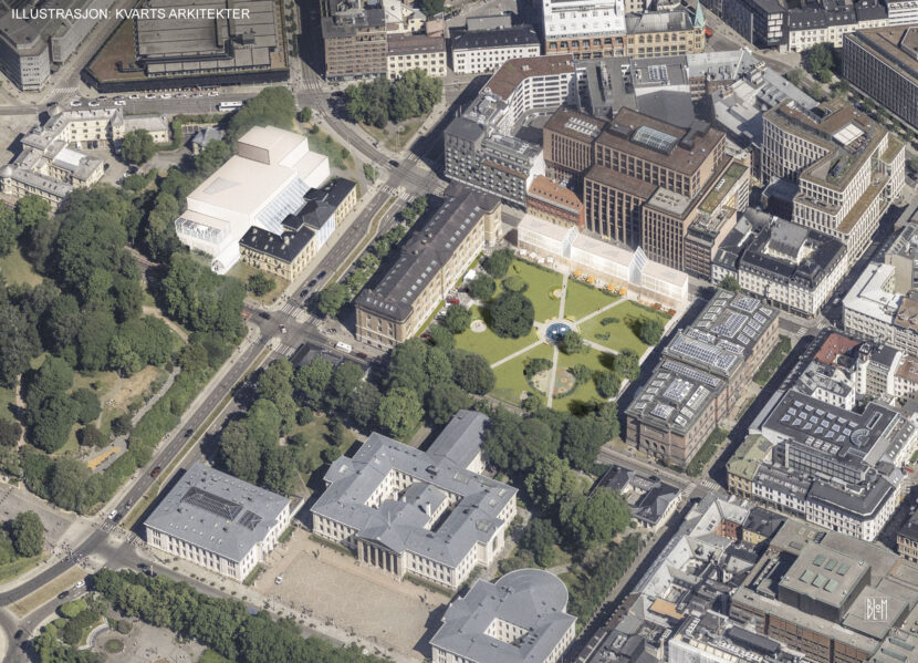 Her kan det gamle administrasjonsbygget for de kulturhistoriske samlingene knyttes sammen med et moderne nybygg for scene- og publikumsfunksjoner og bli et flott supplement til det historiske Nationaltheatret. Publikumsfoaje kan legges mellom det gamle og det nye bygget, og åpne seg både mot Fredriks gate og Slottsparken i vest.