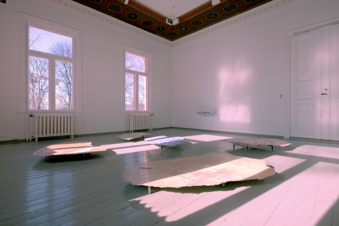 Vel inne i utstillingen viste det seg at besøkets tidspunkt ikke bare var godt, men ypperlig. Den mystiske lyskilden kommer nemlig fra vinduene i utstillingsrommet, kledd med en gjennomskinnelig rosa film. Dette, kombinert med intens sol fra en skyfri himmel, ga en varm glød over det hvitmalte rommet – en slags diskret brytning med den strenge formaliteten av den hvite kuben, det såkalt nøytrale utstillingsrommet nedarvet fra modernismen – og dannet en kledelig ramme rundt den Bergensbaserte kunstnerens skulpturelle installasjonsarbeider.