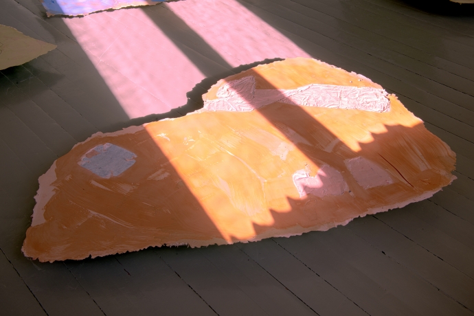 Billedhoggerhusets røkeverelse er fylt med syv beslektede, men samtidig distinkte, skulpturelle arbeider. Fem plassert utover gulvet, og to montert opp mot hver sin vegg – alle malt i duse sjatteringer med hvert sitt pigment spesifisert gjennom titler som «Burnt Umber Flat Pack».
