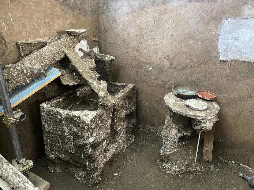 Ved siden av en av mennene ble det funnet spor av det som trolig var en liten bunt av tøy, med et halskjede og noen mynter. I rommet var det også en vase og en samling boller og mugger, mens det i rommet ved siden av var en freske og et trangt bad med toalett.