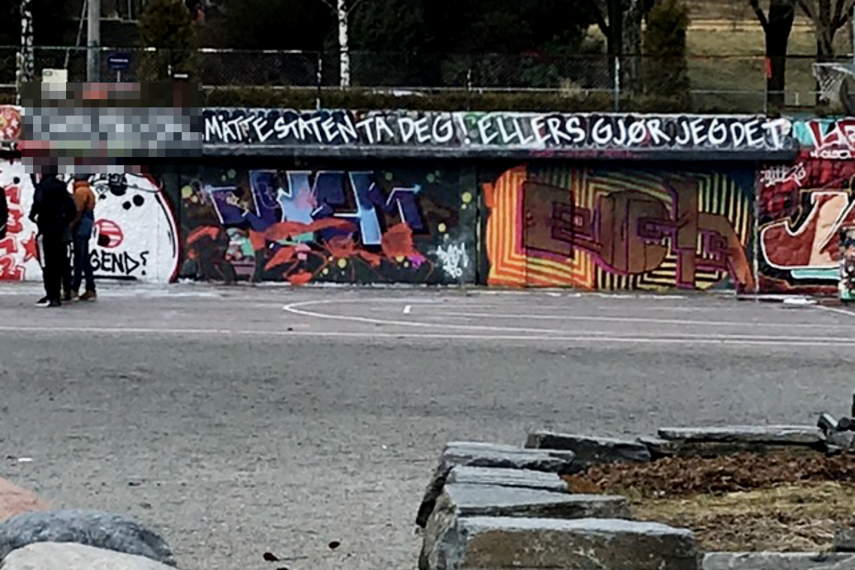 Eller denne, som ble påført Torshovparken midt under hovedforhandlingen: «XXX XXX, MÅTTE STATEN TA DEG! ELLERS GJØR JEG DET!».
