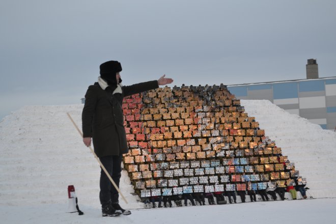 Teaterregissør og kunstner Morten Traavik i Kirkenes med norske NATO-soldater som ble instruert av nordkoreansk militær. (Foto: Traavik.Info)