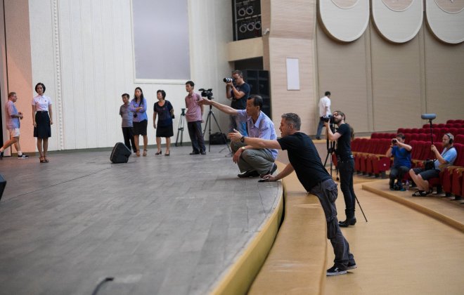 Morten Traavik gir regi på Laibach og de koreanske vokalistene under forberedelsene av konserten i anledning den koreanske frigjøringsdagen fra Japan. (Foto: Traavik.Info.)