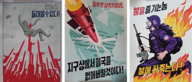 PROPAGANDA: Bildene viser nordkoreanske propaganda-plakater som har prydet Pyeongyang i det siste. (Foto: Morten Traavik.)