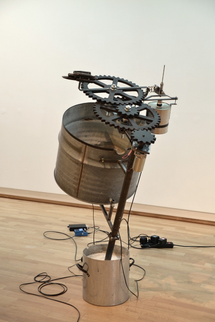 I utstillingen på Oslo Prosjektrom får vi oppleve installasjonen «Sustain» fra 2018, som består av oljefat, store tannhjul og betong og har et grovt og industrielt preg over seg. Verkets ulike deler både beveger på seg og fungerer som høytalere, og tilsammen skaper det et dystert og klangrikt lydbilde som fyller hele rommet.