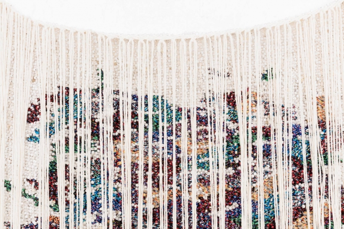 (Verket «Prayer rug 11» (2018) av Igshaan Adams består av både tekstil og små perler i glass, tre og plast. Foto: Akershus Kunstsenter)