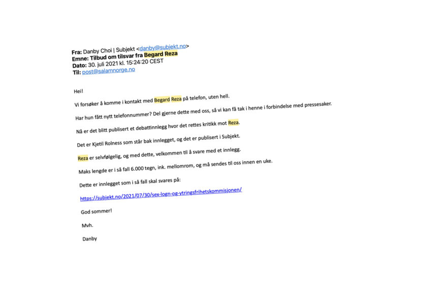 Noen minutter senere får vi ikke telefonnummeret hennes, men en e-postadresse som vi fra før av hadde. Og som vi har sendt e-poster til før. Vi visste bare ikke om den fungerte eller ble lest, fordi hun aldri har svart på våre henvendelser til den e-postadressen. Men nå som PFU hadde formidlet den, kunne vi endelig sende Rolness’ kritikk av Begard Reza til sistnevnte med en viss sannsynlighet for at hun kom til å svare oss. PFU hadde jo sagt ifra om at vi kom til å ta kontakt. Vi gir Reza mulighet til å svare på kritikken innen klokken 22.00 torsdag kveld. Og Reza svarte. Med sitt første innlegg i Subjekt ever.