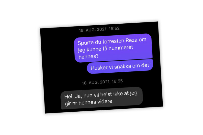 Som svar fikk vi dette: «Hei. Ja, hun vil helst ikke at jeg gir nr hennes videre».