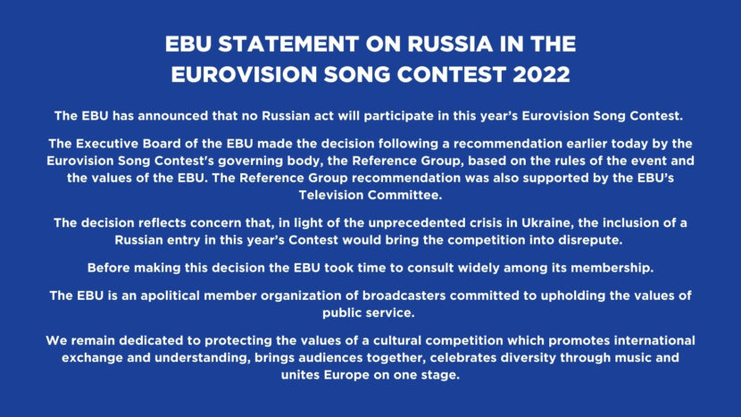 Beslutningen ble tatt fredag etter at EBUs referansegruppe anbefalte utestengelse tidligere på dagen. Beslutningen er tatt på grunnlag av reglene for arrangementet og verdiene til EBU, heter det i kunngjøringen.