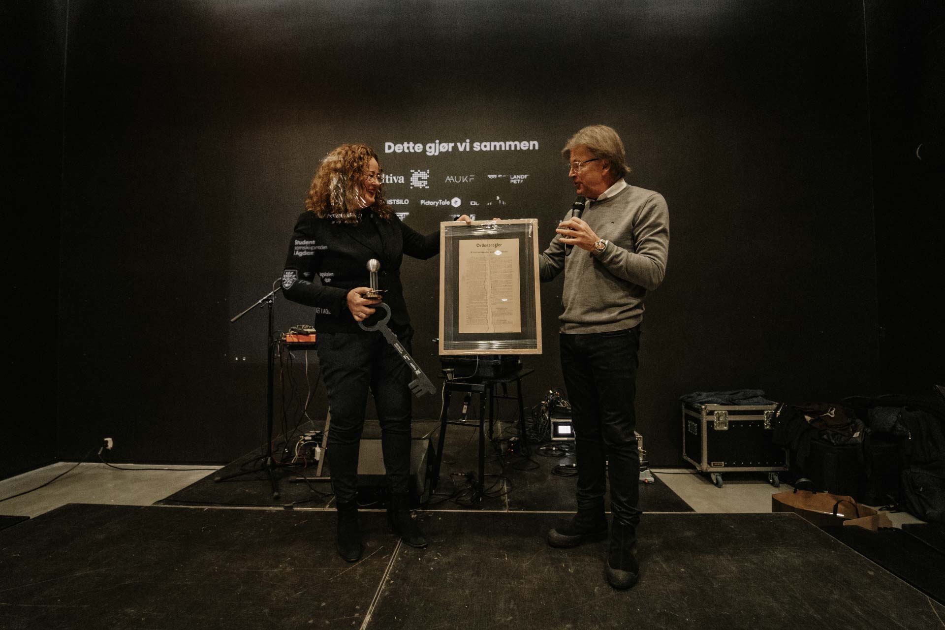 Daglig leder for Cultiva, Kirsti Mathiesen Hjemdahl, mottar nøklene til det gamle kunstmuseet i Kristiansand. (Foto: Victoria Nevland/Presse.)