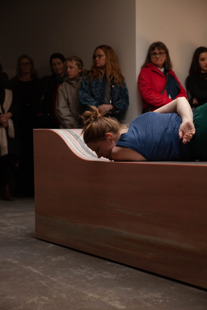 I utstillingslokalet skinner et svakt lys inn gjennom takvinduet. Det er lørdag formiddag, og en gruppe mennesker har samlet seg rundt marmorverket «seng». Det er ikke bare lov å ta på verket, publikum er også invitert til å sitte og legge seg på den sengeformede skulpturen, noe som virker være en glede for flere. En interaktiv start.