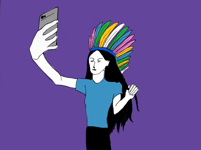 Eksempler på meta-indianere er den kulturelt approprierende Siv Jensen og den angivelige Apache-kvinnen Sacheen Littlefeather, som i 1973 takket nei til Oscar på vegne av Marlon Brando. Du skal ikke kle deg ut som et ekte medlem av den amerikanske urbefolkningen, for så ute av takt med tiden er du selvsagt ikke. Du skal kle deg ut som en som kler seg ut som en indianer. Vær nøye med å bruke det politisk ukorrekte ordet «indianer» om deg selv. Folk kan bli redde for at du faktisk mener det og at de ikke er skarpe nok til å fange opp din utspekulerte ironi. Men her er det du som sitter med makten til å gjøre narr, av alle som ikke forstår at det er de du etterligner, som er moralsk forkastelige, ikke du.