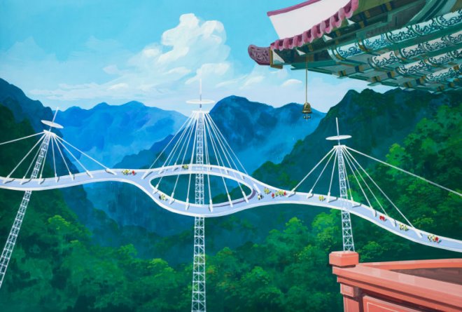 En fotgjengerbro som skal kunne la reisende gå gjennom tåken i “The Diamond Mountains”. (Foto: Koryo Group)