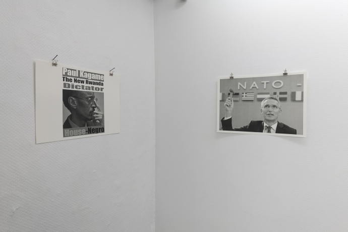 I lokalets første rom har kunstneren Fadlabi hengt opp en rekke nyhetsartikler, som han har samlet på i en årrekke. Det første blikkfanget er to bilder av Michael Jackson, ett hvor han fortsatt har mørk hud, og det andre hvit.