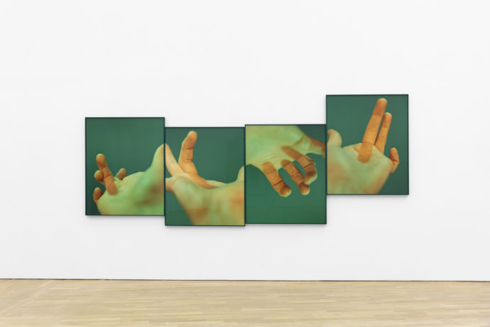 Noen av verkene utforsker persepsjon ved å gjøre tilskueren oppmerksom på sin plassering i forhold til fotografiet. En av de første verkene vi møter i utstillingen er en mixed-media-installasjon av Maya Rochat, kalt «Living in a Painting» (2019), hvor flere meter lange plastaktige ark henger fra taket og ligger utstrakt på gulvet. Installasjonen vekker en følelse av å tre inn i fotografiets eget rom.