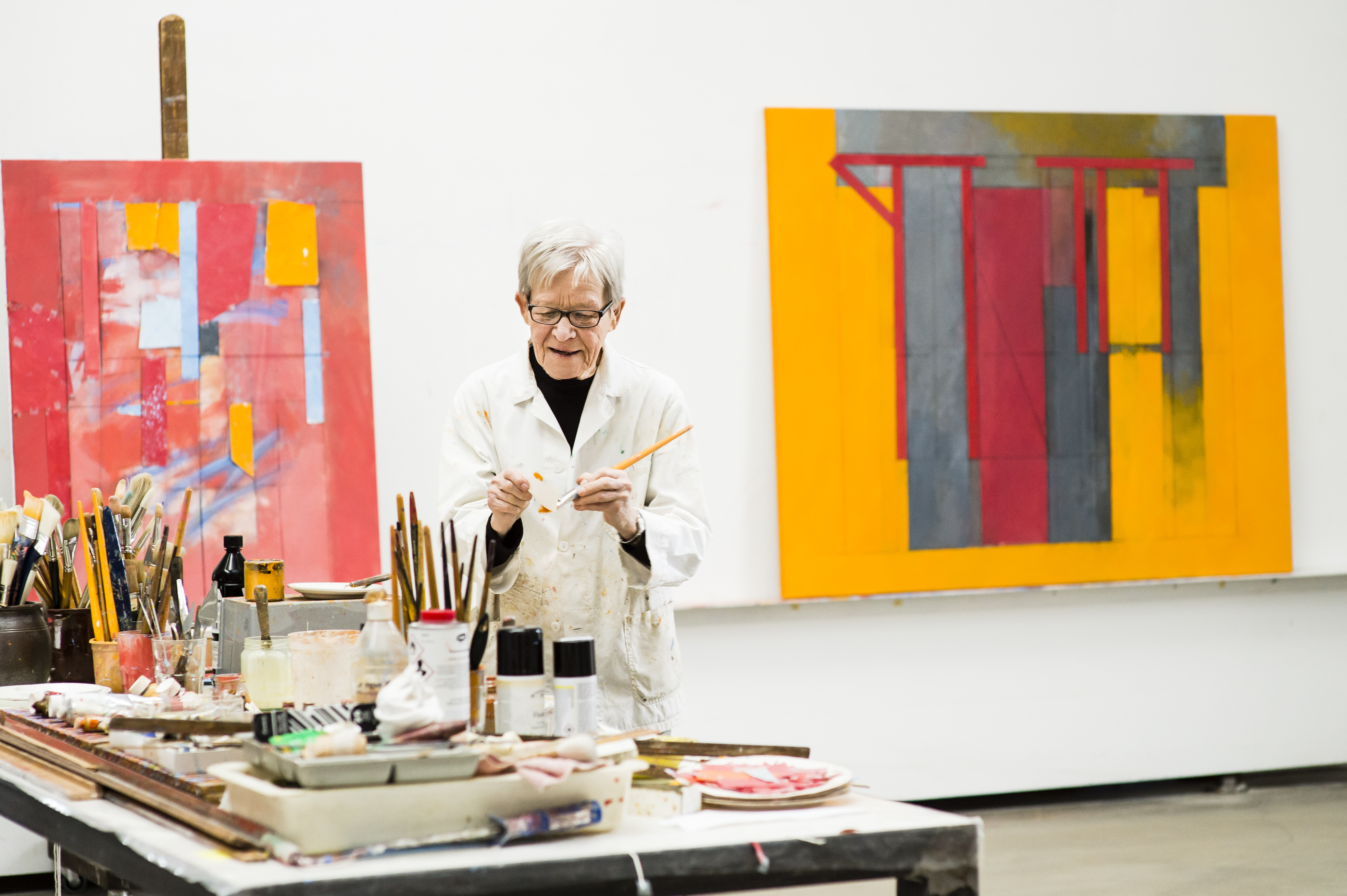 Det store atelieret er høyt under taket og har enorme vinduer som slipper dagslyset inn. 88-åringen begynte å jobbe her for ti år siden, etter at arkitekten Sverre Fehn utformet renoveringen av bygget.
