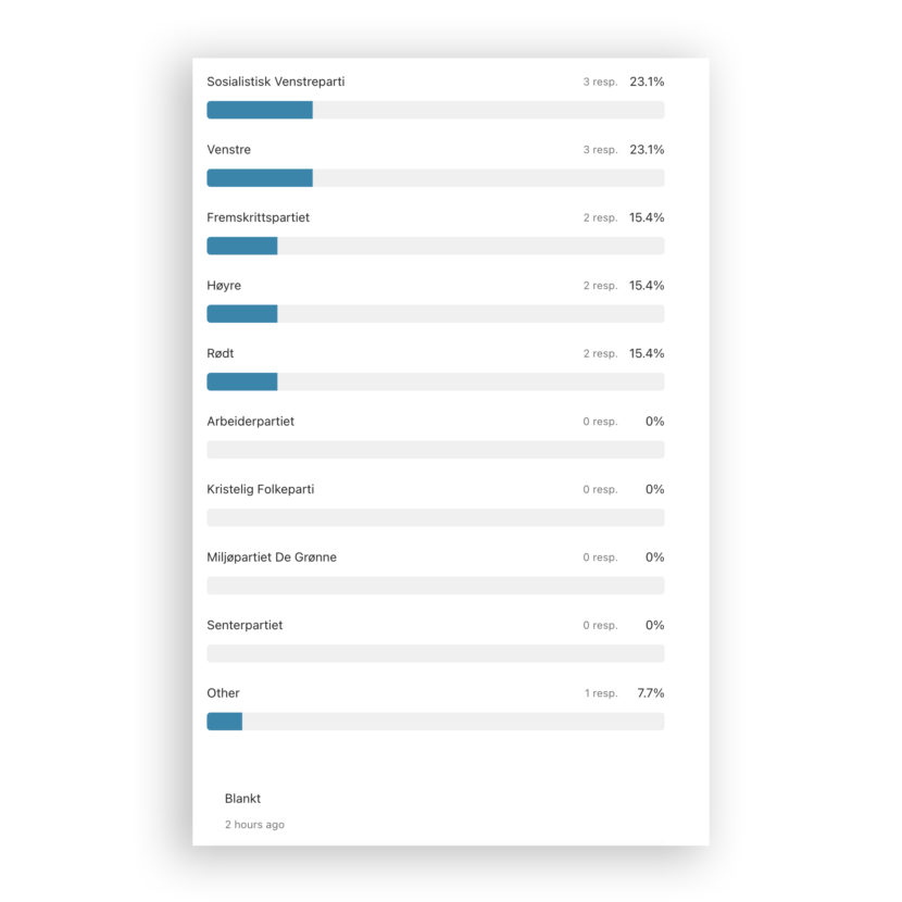 Hele 7,7 prosent svarer «Annet». Blant disse er det flere som peker på det nye partiet Industri- og næringspartiet (INP)