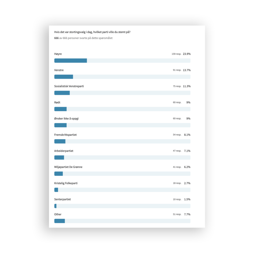 Blant leserne er Høyre størst, med 23,9 prosent av stemmene. 159 respondenter valgte Høyre, av totalt 666 respondenter.