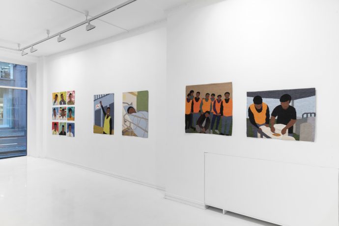 Olsson har brukt mye av sin tid på å hjelpe unge tenåringer på flukt, isolert i varetekt. Her var også selvmordsrisikoen ekstra høy, og Olsson kjempet for å få guttene til å overleve. Disse historiene har hun vevd i lin, utstilt på Soft galleri i Oslo. (Foto: Øystein Thorvaldsen.)