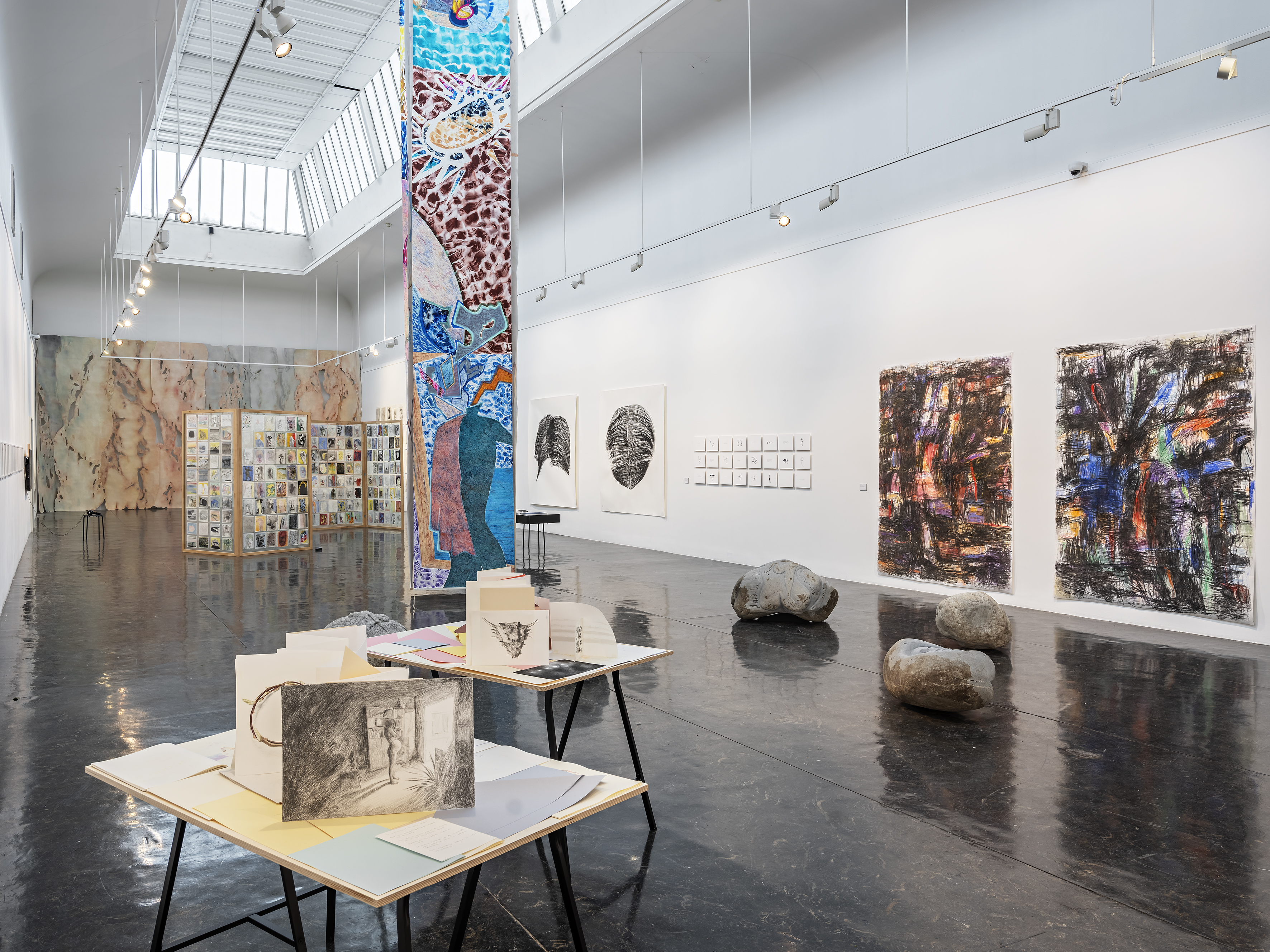 I midten av rommet til venstre for trappen henger det fire store remser med papir i form av en søyle, fra taket og ned til bakken. Abstraherte kroppsdeler og frukt flyter i et landskap av batikk og fossil-lignende mønstre. Noe som minner om biter av internett svever forbi. Det er verket «Restless Column» av Ida Madsen Følling vi ser på. Menneskets plassering blant fossiler og cyberspace i tegningen tilbyr en referanseramme for en overordnet menneskelig opplevelse. Vår urhistoriske ætt knyttes til moderne teknologi som virtuell virkelighet, i en flytende tidsforståelse.