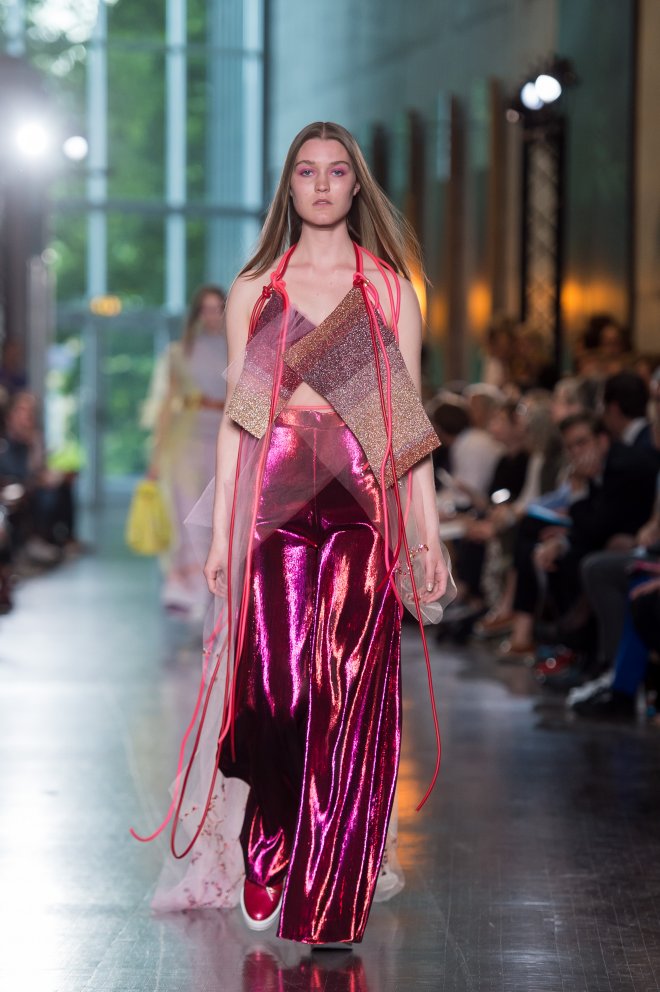 – Jeg er opptatt av håndverket. I denne kolleksjonen har jeg strikket, sydd, frynset, pusset og saget. De strikkede materialene er en tolkning av døgnet, hvor døgnets farger representerer tid, bevegelse og vandring. Konseptet for kolleksjonen kommer fra en tanke om tilhørighet mellom mennesker i en verden uten grenser, kun avstander. Kolleksjonen inneholder elementer og materialer hentet fra sør, øst, vest og nord. Hvert antrekk er bygget opp som individuelle karakterer, fargelagt av døgnet. Sammen danner de en kvinnelig flokk på vandring. Jeg ser på kolleksjonen som et tredimensjonalt bilde formet rundt kropp.