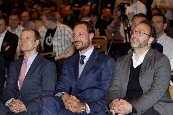 Grunnlegger Jimmy Wales kan fredag feire at Wikipedia er 20 år. Her er Wales (til høyre) sammen med tidligere utviklingsminister Heikki Eidsvoll Holmås (SV) og kronprins Haakon. (Arkivfoto: Terje Bendiksby/NTB.)