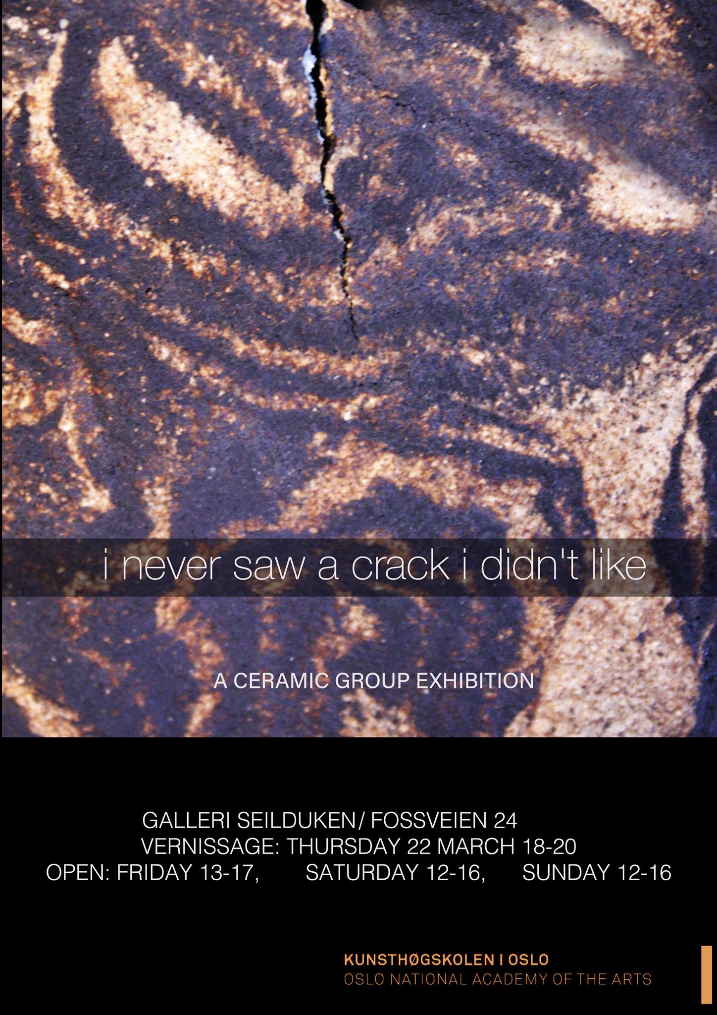 Galleri Seilduken inviterer denne helga til et innblikk i keramikkavdelinga på KHiO. «I never saw a crack I didn’t like» vises verk av avdelingens bachelor- og masterstudenter, så vel som verk av fem professorer ansatt ved avdelingen. Her vil man ikke bare kunne se et utvalg keramiske verk fra avdelingen – og kanskje få en idé om hvordan studenter og professorer arbeider sammen – man vil muligens også kunne spore noen nye tendenser på den norske keramikkscenen.