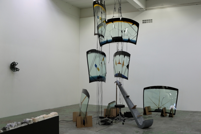 Hedvig Winges «knekkebrødskulptur», «Stay» (2009-2019), peker inn mot Siri Austeens massive installasjon: «Det som beveges flytter seg» (2019). Det ligner bilvinduer som er hengt opp i ulike nivåer og skaper en konstruksjon som virker tilfeldig, eller kanskje organisk. Uttrykket er først og fremst slående. Nysgjerrigheten pirres også av ledningene som ligger hulter til bulter på bakken, fordi det hinter om at det skal oppstå lyd.