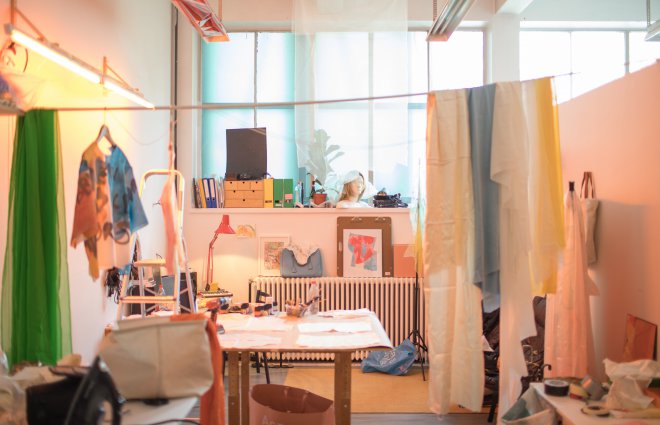 – Jeg har mange prosesser gående samtidig, og arbeider med korte tidsrammer for å konsentrere et spontant innhold. Jeg veksler mellom å jobbe impulsivt og strukturert, mellom helhets- og detaljarbeid. Det er bra å ha samtaler med kollegaer også, det er det fine med å være i et studiofelleskap, å kunne rope over veggen for å finne ut om trådfargen på kostymet burde være hvit eller burgunder.
