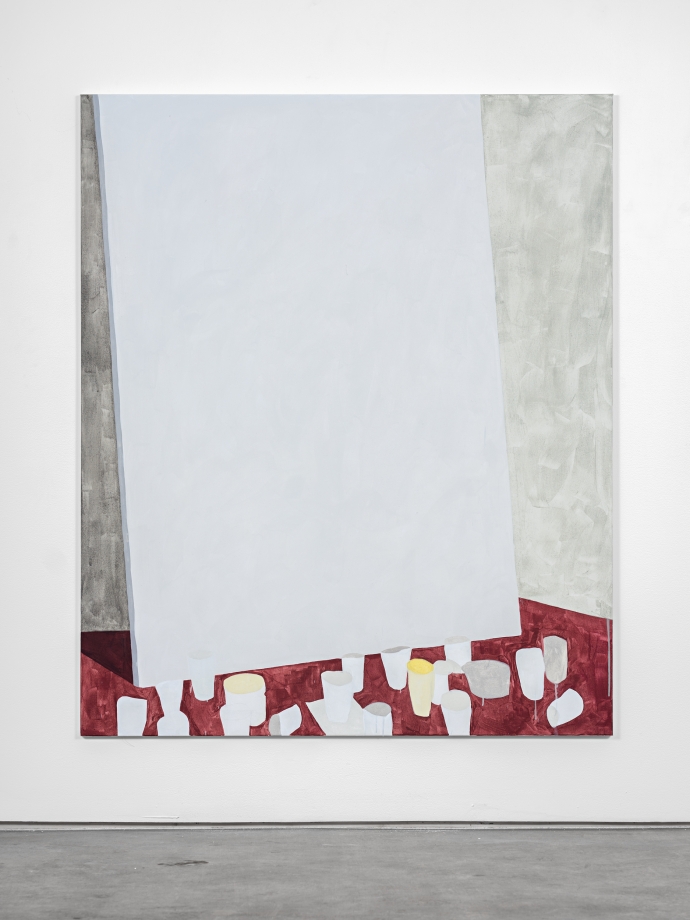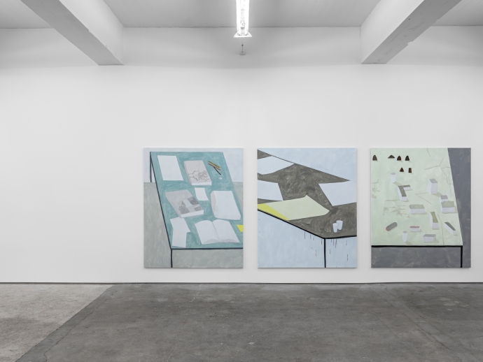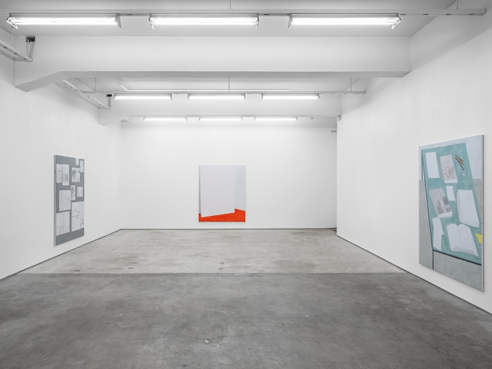På veggene henger syv store akrylmatte malerier luftig montert. Alle malt i gråtoner og pastellfarger med små drypp av kontrasterende fargenyanser: Orange, grønn, dyp rød. Det første som melder seg er irritasjon; utstillingen virker ved første øyekast å være et etterslep av en uendelig tradisjon med døllt minimalistisk samtidsmaleri som hverken gir eller tar. Hvor er lekenheten? Innspillet fra galleripersonalet bærer arkitektoniske referanser. Imitasjoner av blokkarkitektur med lerret som motiv og medium? Blabla. Sett hva som helst på høykant og det er et bygg.