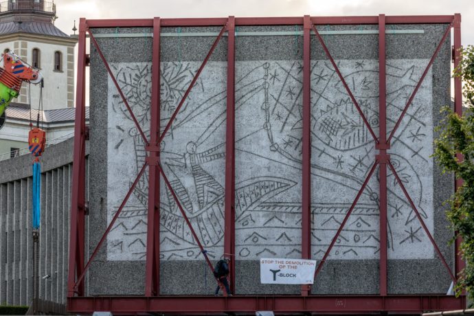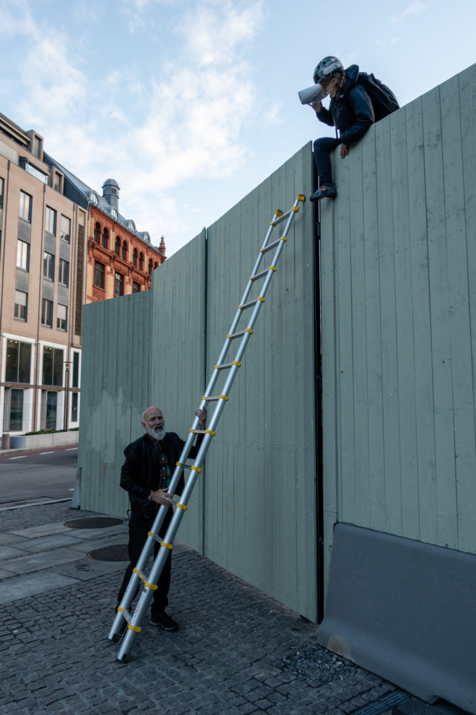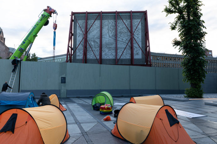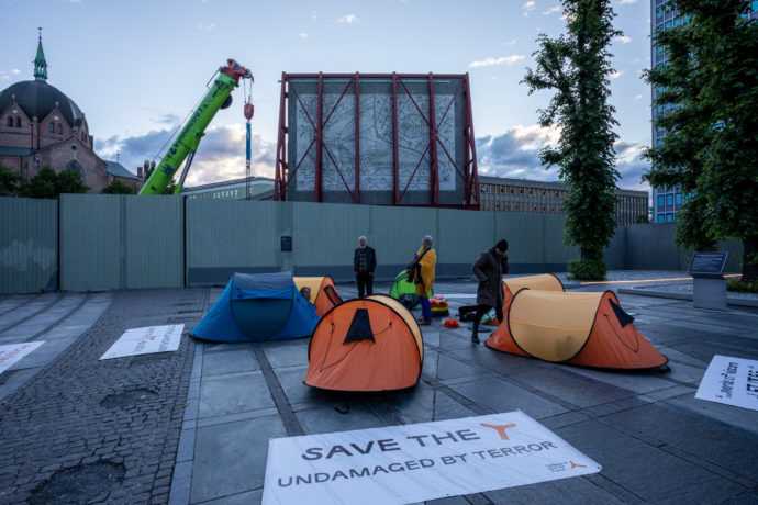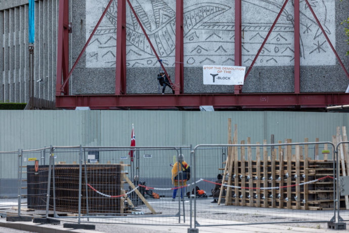 Natt til tirsdag foregikk det en vake foran bygget, hvor flere aktivister hadde slått opp telt. En av av dem klatret på et tidspunkt over gjerdet og festet en banner i støtterammen. Banneret hadde teksten «Stop the demolition of the Y-block».