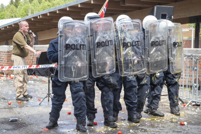 Politiet til forsvar for ytringsfriheten: Leder Lars Thorsen i Stopp islamiseringen i Norge (SIAN) med stand og demonstrasjon på Mortensrud i Oslo. (Foto: Foto: Terje Pedersen/NTB scanpix.)